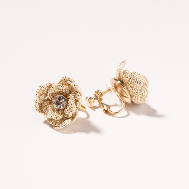 花をモチーフに淡路結びを組み合わせた耳飾りです。 イヤリングかピアスでお選びいただけます。 キラキラ輝くラインストーンをあしらい普段使いはもちろん、お呼ばれコーデにも映えます。 色は黒・茶色・青・ベージュ・ゴールド・白・白ラメ・の7色展開です。 ピアス・イヤリングは“オプションなし”でアレルギー対応しています。(ゴールドはニッケルフリー・シルバーはステンレス) 金具部分のお色味はゴールド・シルバーでお選びいただけます。アレルギーに不安がある方はニッケルフリーのゴールドよりアレルギーが出にくいステンレスのシルバーをお勧めします。 ※アレルギー反応が出にくい素材を使用しておりますが、全ての方のアレルギーに対応している訳ではございませんので、痒みやかぶれなどの異常が出た場合には速やかに使用を中止し、医師へ相談してください。 ■ 商品詳細 - 品番: yk-er01-aj02-yg(イヤリング),yk-er02-aj02-yg(ピアス) - カラー: ゴールド - サイズ: 幅約2.5cm×高さ約2.5cm - 素材:水引 / ラインストーン(ガラス・真鍮) 金具: ゴールド:ニッケルフリー加工(下地はステンレス) シルバー:ステンレス - 製造国: 日本 ■ お手入れ/取り扱い注意事項 - 水引は芯に和紙を使用しているため、水に弱い性質があります。万が一、水に濡れた場合はすぐに乾いた布で擦ったりせず、押し当てるように優しく拭き取ってください。 - 強く引っ張ったり、擦ったりしないでください。色褪せや形状の歪みの原因になります。水引は繊細な素材のため、一度歪みが発生してしまうと元の状態に戻すことは難しいため、ご使用の際はお気をつけください。 - 整髪料を使用する際はバレッタにかからないようにお使いください。バレッタに整髪料が付着すると、変色や劣化につながる恐れがございます。整髪料をつける際は十分にお気をつけください。 - お客様に長く大切に商品を使用していただきたいという思いから、購入日より3ヶ月間のお直し無料サービスがついております。こちらは期間内に1回限り、使用後の商品でもお使いいただけます。お直し無料サービスの期限が過ぎてしまった場合や期間内でも2回目以降のお直し(パーツ交換も含む)は有償で承らせていただきます。ご了承ください。 ■ 発送・注文に関する情報や注意事項 - ご注文確定後、通常5営業日以内に発送いたします。 -お急ぎの方は購入前にお問い合わせフォームよりご相談ください。 ■ その他の情報や注意事項 -水引作品はとても繊細です。取り扱いには十分ご注意ください。 - yuwakの商品はひとつひとつ手作業で丁寧に仕上げております。そのため、掲載写真と風合いが若干異なることがございます。商品の形状はひとつとして同じものはございませんのでアクセサリーの個性としてお楽しみください。 - 商品写真はできる限り実物の色に近づけるよう徹底しておりますが、 お使いのモニター設定、お部屋の照明等により実際の商品と色味が異なる場合がございます。ご了承ください - お客様都合での交換・返品は受け付けておりません。商品は発送前に入念に検品をしておりますが、万が一商品に不良があった場合は到着から5日以内に[email protected]宛にメールで商品不良の旨、お問い合わせ下さい。(写真を合わせて送っていただけますと早めの対応が可能です。)不良が認められた未使用品に限り、交換または返品対応させていただきます。