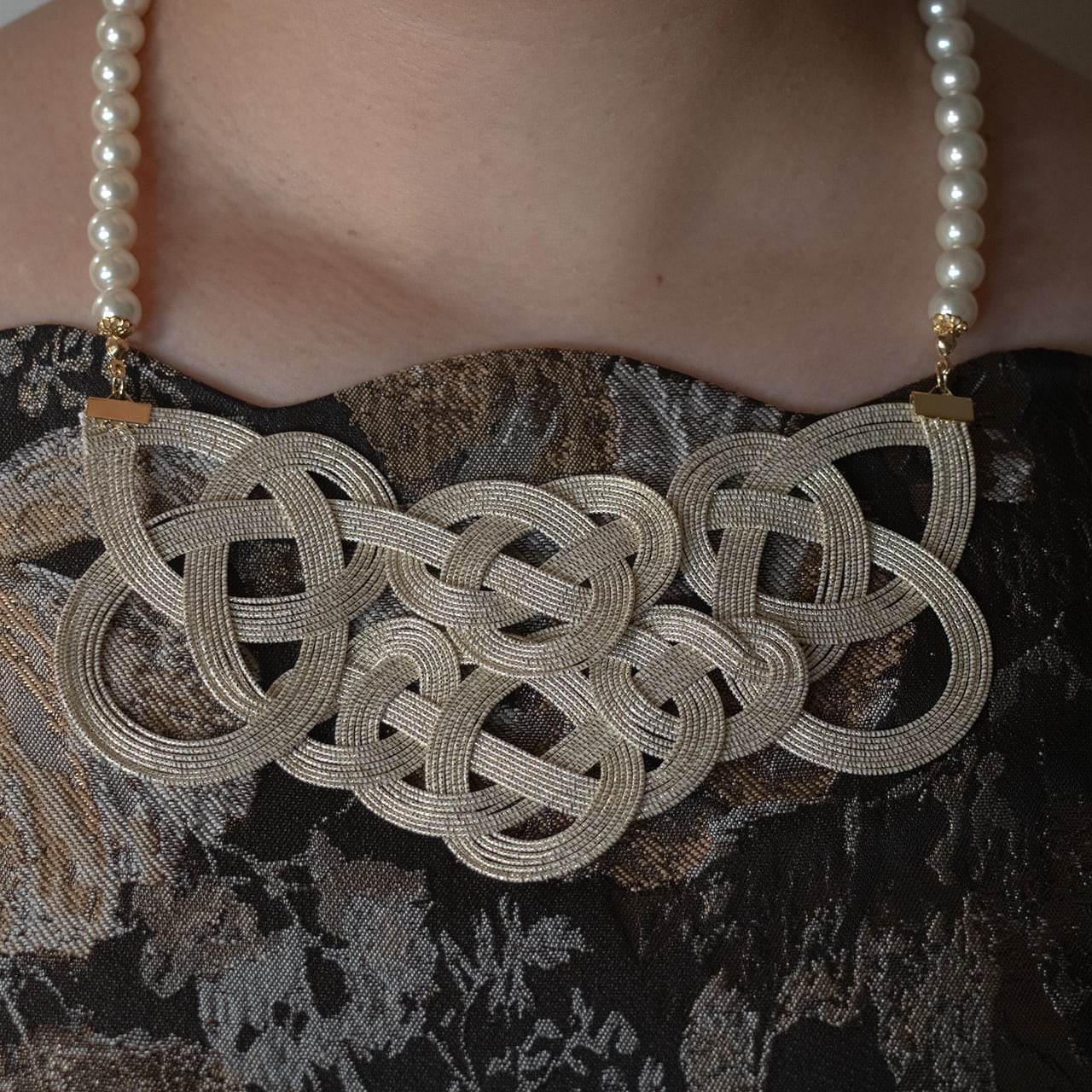 洗練された和の美しさを身に纏う『AWAJI|ネックレス gold』 伝統的な淡路結びをアレンジしたモチーフにパールを組み合わせ、ネックレスに仕立てました。 美しい曲線を描く水引とパールの調和が洗練された大人のおしゃれを楽しませてくれます。 水引のしなやかさとパールの柔らかさによってカジュアルからフォーマルまで幅広いコーディネートに合わせることができます。 ワンタッチで簡単に装着できるニューホックという留め具を使用しております。 また、この商品はイミテーションパールの中でも真珠に近い輝きを放つクリスタルガラス製の「プレシオサパール」を使用しています。 ■ 商品詳細 - 品番:yk-nl-aj01-ygp - カラー: ゴールド - サイズ: 首周り約51cm / モチーフ:約15cm×約7.5cm / ビーズ部分:約36cm - 素材: 水引, プレシオサパール, 真鍮 - 製造国: 日本 ■ お手入れ/取り扱い注意事項 -水引は芯に和紙を使用しているため、水に弱い性質があります。万が一、水に濡れた場合はすぐに乾いた布で擦ったりせず、押し当てるように優しく拭き取ってください。 - 強く引っ張ったり、擦ったりしないでください。色褪せや形状の歪みの原因になります。水引は繊細な素材のため、一度歪みが発生してしまうと元の状態に戻すことは難しいため、ご使用の際はお気をつけください。 -お客様に長く大切に商品を使用していただきたいという思いから、購入日より3ヶ月間のお直し無料サービスがついております。こちらは期間内に1回限り、使用後の商品でもお使いいただけます。お直し無料サービスの期限が過ぎてしまった場合や期間内でも2回目以降のお直し(パーツ交換も含む)は有償で承らせていただきます。ご了承ください。 ■ 発送・注文に関する情報や注意事項 - ご注文確定後、通常5営業日以内に発送いたします。 -お急ぎの方は購入前にお問い合わせフォームよりご相談ください。 ■ その他の情報や注意事項 -水引作品はとても繊細です。取り扱いには十分ご注意ください。 - yuwakの商品はひとつひとつ手作業で丁寧に仕上げております。そのため、掲載写真と風合いが若干異なることがございます。商品の形状はひとつとして同じものはございませんのでアクセサリーの個性としてお楽しみください。 -商品写真はできる限り実物の色に近づけるよう徹底しておりますが、 お使いのモニター設定、お部屋の照明等により実際の商品と色味が異なる場合がございます。ご了承ください -お客様都合での交換・返品は受け付けておりません。商品は発送前に入念に検品をしておりますが、万が一商品に不良があった場合は到着から5日以内に[email protected]宛にメールで商品不良の旨、お問い合わせ下さい。(写真を合わせて送っていただけますと早めの対応が可能です。)不良が認められた未使用品に限り、交換または返品対応させていただきます。