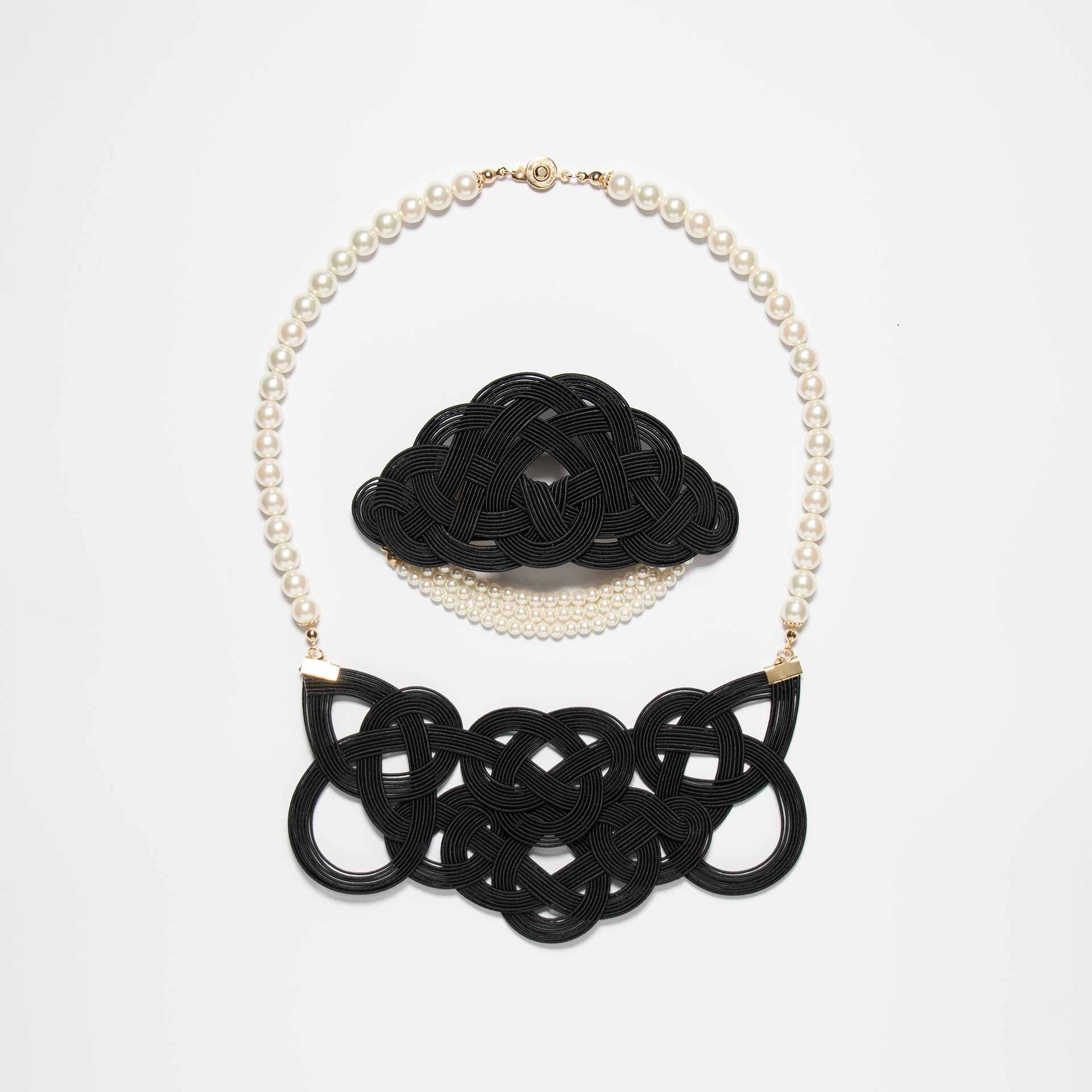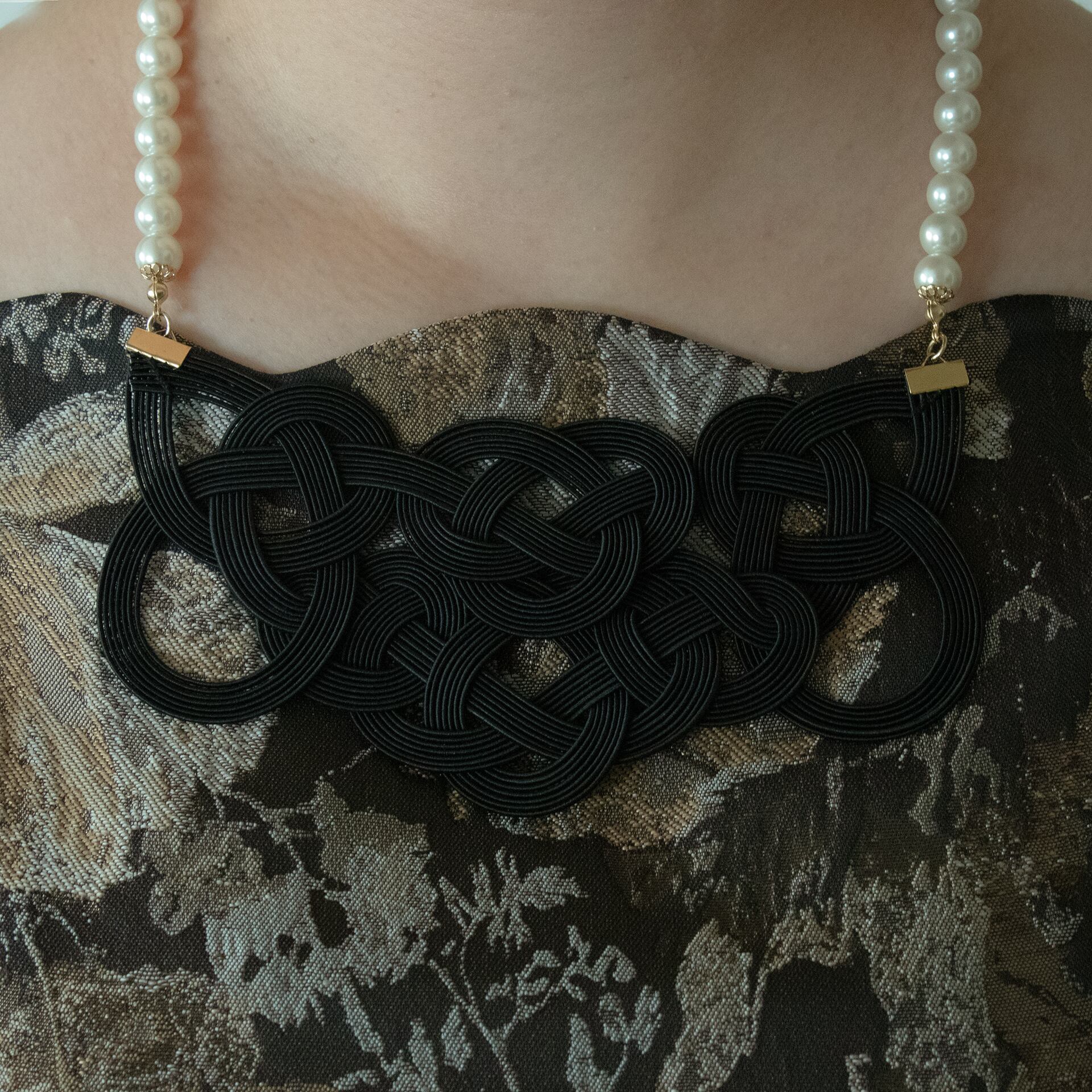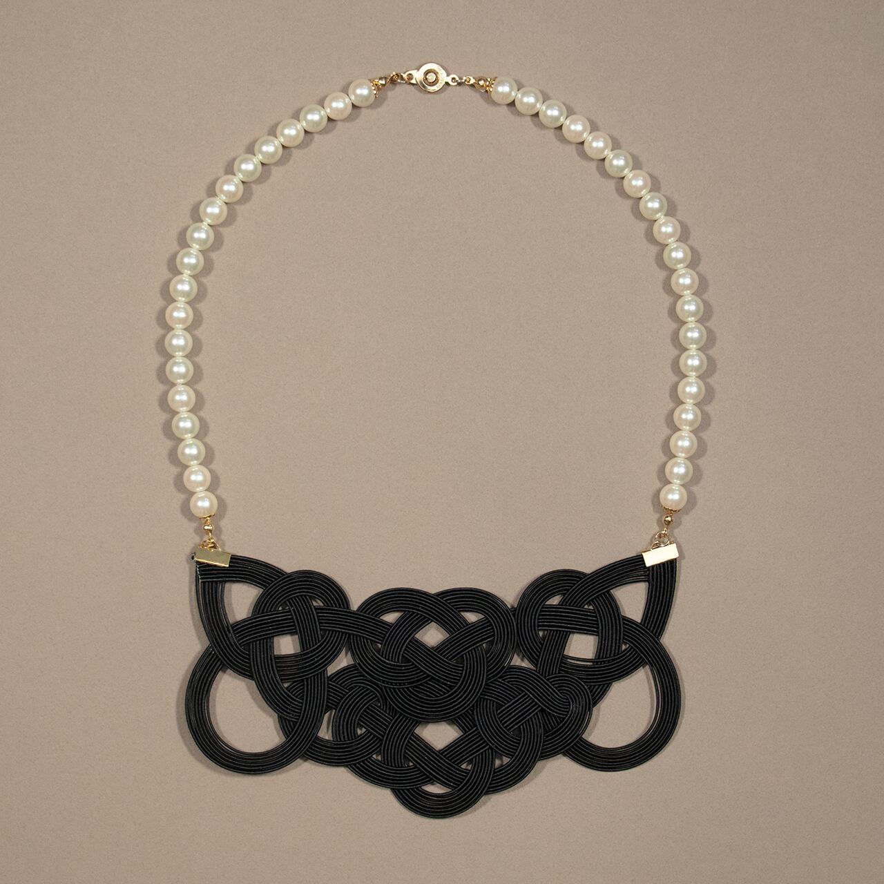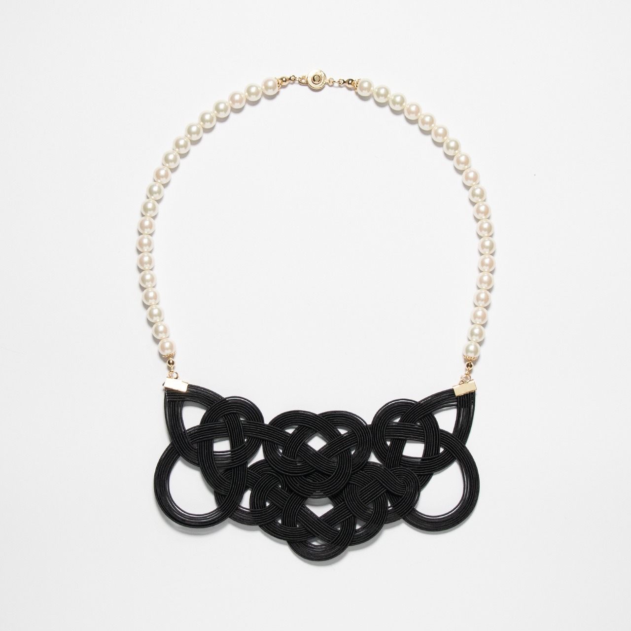 伝統的な淡路結びをアレンジしたモチーフにパールを組み合わせ、ネックレスに仕立てました。