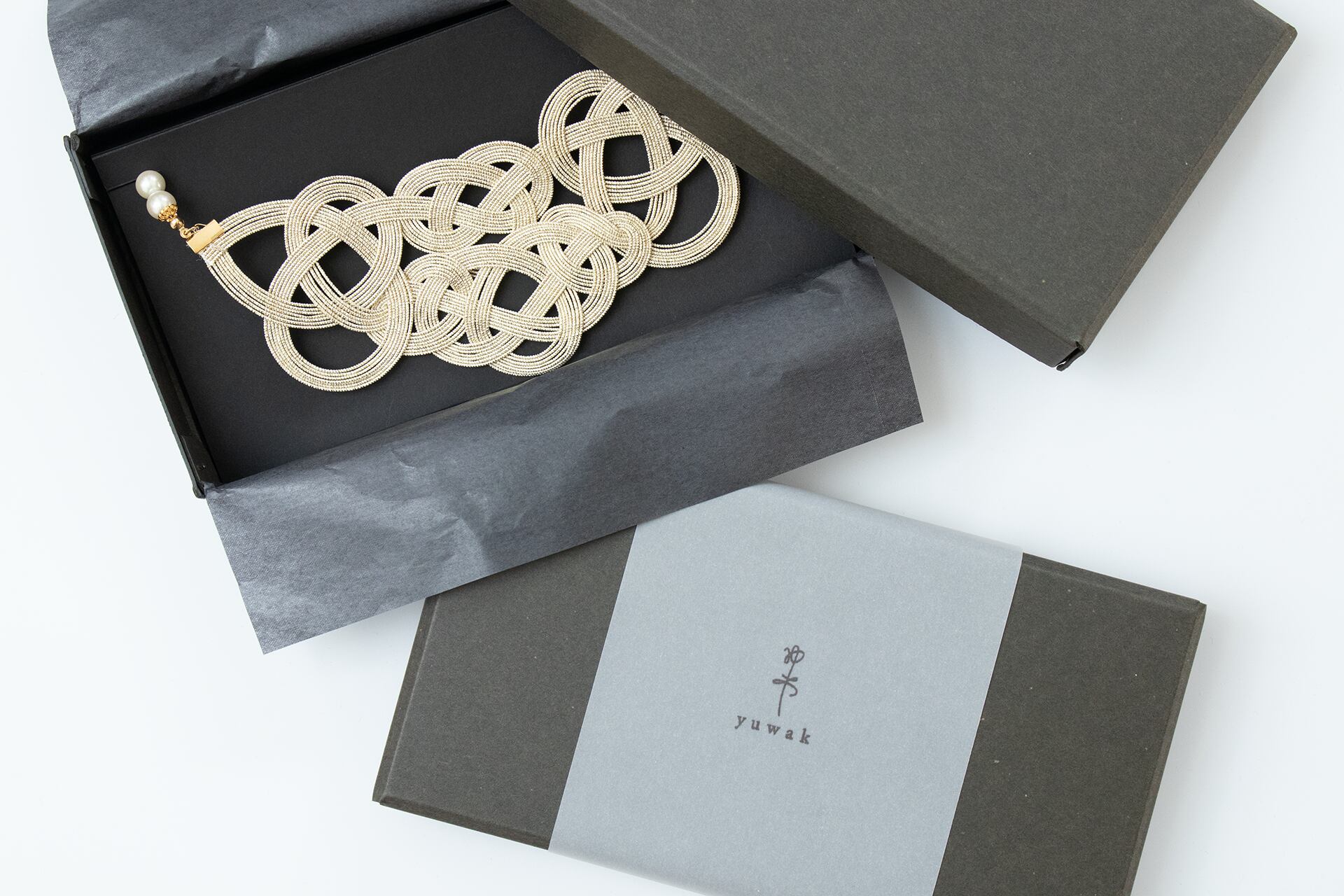 美しい曲線を描く水引とパールの調和が洗練された大人のおしゃれを楽しませてくれます。