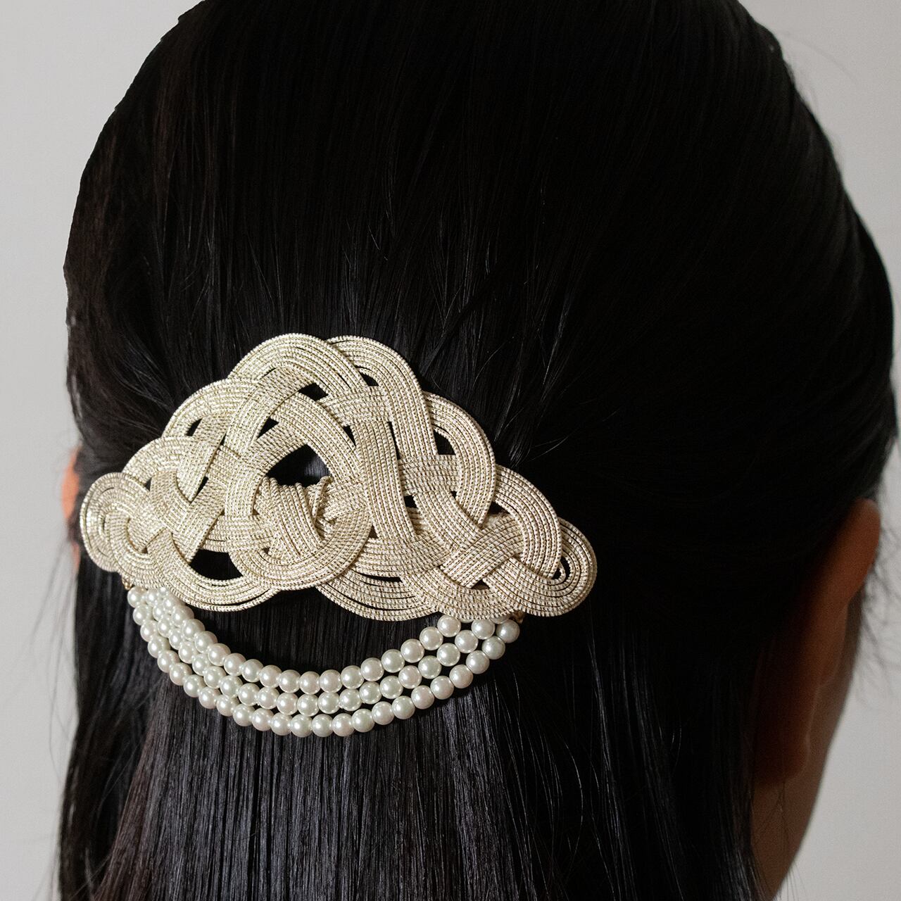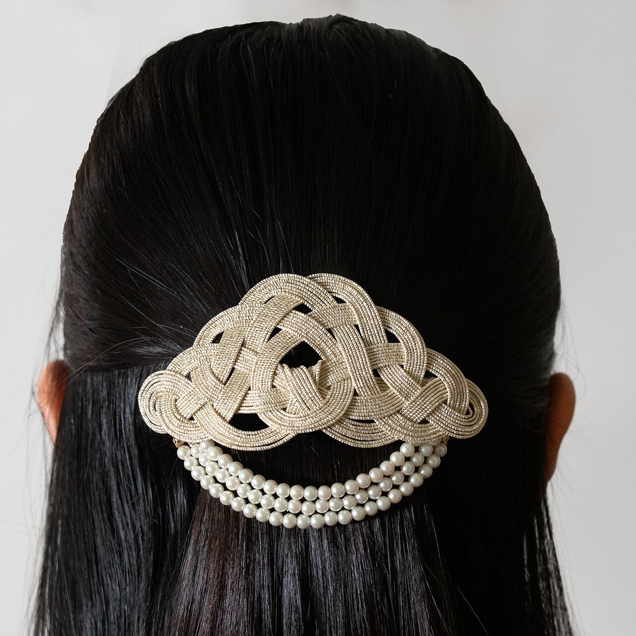 水引の結び方の一つである「松結び」にアレンジを加え、大きすぎず小さすぎない、ちょうど良いボリューム感のバレッタに仕上げました。